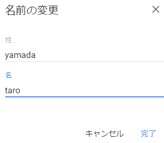 名前の変更で「姓」「名」を入力し「完了」をクリック