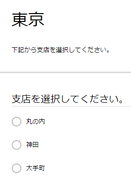 セクションが追加されたら、質問や文章を作成 ▼「東京」を選択 → 都内の支店から選択(絞り込み)