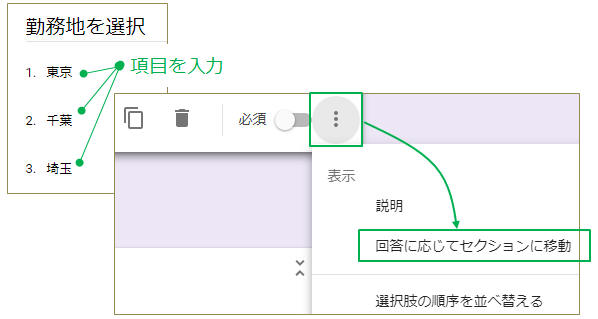 ー 絞り込みPOINT ― ★絞り込み回答が可能なのは【プルダウン】と【ラジオボタン】です。 ★回答に応じた行き先は【セクション】です(よってセクションを挿入し、質問を作成しないと行き先を指定できない) Googleフォームを開き「質問を追加」をクリック 「プルダウン」または「ラジオボタン」をクリック 質問を作成し右下の「オプション」ボタンから「回答に応じてセクションに移動」をクリック 回答に応じて次の質問画面に移動できるようになります。 移動先は【セクション】ですので、セクションを追加します。 セクションが追加されたら、質問や文章を作成 ▼「東京」を選択 → 都内の支店から選択(絞り込み) 移動先のセクションが全て追加できたら絞り込み問題に戻ります。 回答に応じて移動するセクションを選択 プレビュー をクリックして動作確認する