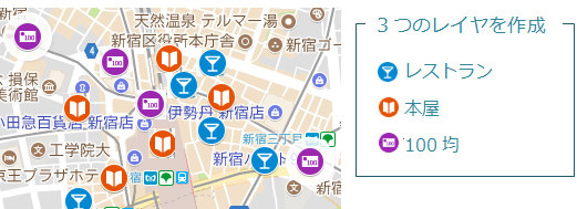 上の地図では【レストラン】【本屋】【100均】などの住所録データを分けておき、この3つのデータをそれぞれのレイヤとしてインポートしマークしています。
