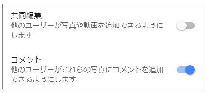 相手に共有アルバムへの追加(アップロード)を許可する場合は「その他のオプション」ボタン →「共有オプション」→「共同編集」をONにします。コメントの追加を許可する場合は「コメント」をONにします。(注!共有アルバムへの追加や、コメント入力をするユーザーはGoogleアカウントが必要です)